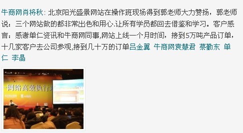 2012年,牛商網(wǎng)是不斷成長的一年,這一年,幫助了老兵茅臺,月子雞,桑樂太陽能,陽光盛景等700多家企業(yè)建立了營銷型網(wǎng)站,平均每月建站60多個,每天都有企業(yè)向牛商網(wǎng)營銷型網(wǎng)站建設(shè)公司報喜,牛商網(wǎng)建設(shè)的營銷型網(wǎng)站給他們企業(yè)領(lǐng)來了一個個訂單!詳情可點擊