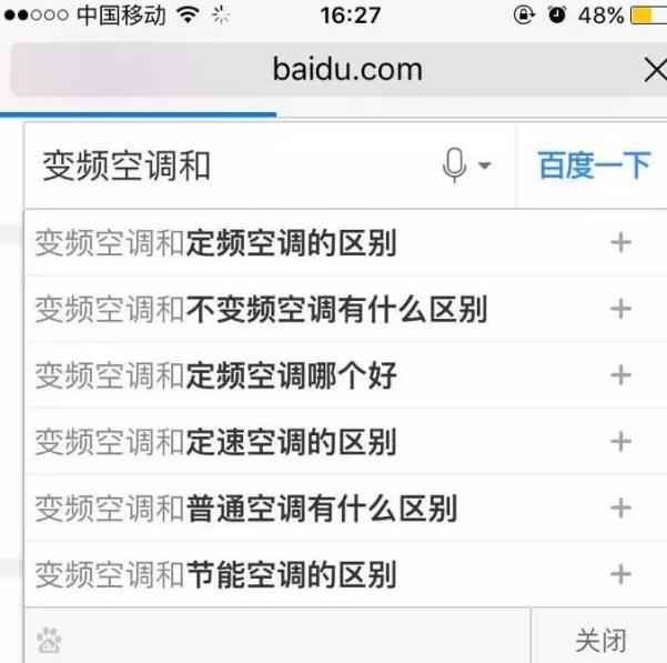 b.長詞:主要包括咨詢詞與型號詞,如下圖,在輸入幾個文字后,會有下拉詞提示,所以很多移動用戶會選擇下拉欄里的搜索詞??梢愿鶕?jù)下拉欄提示的關(guān)鍵詞添加到賬戶中。