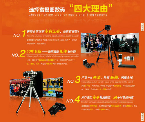 廣州富攝圖公司創(chuàng)立于2005年。一直從事數(shù)碼影像器材產(chǎn)品的研發(fā)和銷售。為了拓寬市場(chǎng),把中國(guó)創(chuàng)造的產(chǎn)品更好地銷售到國(guó)外市場(chǎng),公司在服務(wù)好國(guó)內(nèi)市場(chǎng)的同時(shí),于2009年在香港注冊(cè)了富士圖攝影器材(香港)股份有限公司。專門(mén)成立了電子商務(wù)外貿(mào)部。目前產(chǎn)品已經(jīng)遠(yuǎn)銷到海外60多個(gè)國(guó)家和地區(qū)。大大地提高了中國(guó)產(chǎn)品在海外的輻射力。
