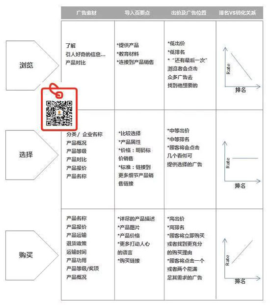 這是資深SEM人員整理出來(lái)的關(guān)系圖表。圖中最左側(cè)瀏覽、選擇和購(gòu)買為關(guān)鍵詞的購(gòu)買意向階段;廣告素材指的是創(chuàng)意內(nèi)容;導(dǎo)入頁(yè)面要點(diǎn)為著陸頁(yè)建設(shè)內(nèi)容;出價(jià)和廣告位置就是廣告的排名和展現(xiàn)位置;最后一欄為排名與轉(zhuǎn)化率之間的關(guān)系圖。下面牛商網(wǎng)小編帶你對(duì)排名和轉(zhuǎn)化率之間的關(guān)系圖進(jìn)行解讀:
