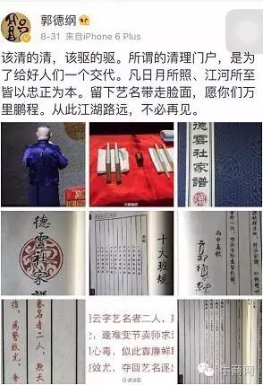 △8月31日,郭德綱在微博曬出德云社家譜,及“十大班規(guī)”,稱曾用云字藝名的二人欺天滅祖悖逆人倫,奪回藝名逐出師門。
