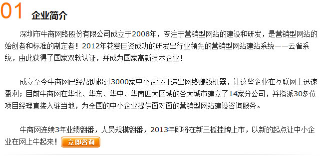 在策略班上課后宮總馬上行動(dòng),找牛商網(wǎng)建設(shè)營銷型網(wǎng)站并且報(bào)了七個(gè)操作班,上線兩個(gè)月,就接到了500萬的訂單,并且在2013年初就在網(wǎng)上接到了亞馬遜的訂單,詢盤率提升了100% + 了解詳情