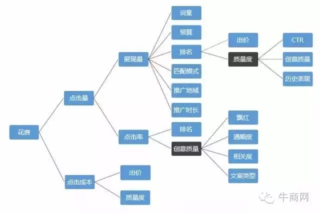 影響搜索推廣前端數(shù)據(jù)表現(xiàn)的因素:根據(jù)數(shù)據(jù)報告找出前端效果不好的原因,再根據(jù)以上關(guān)系圖譜對影響因素進行調(diào)整,優(yōu)化。