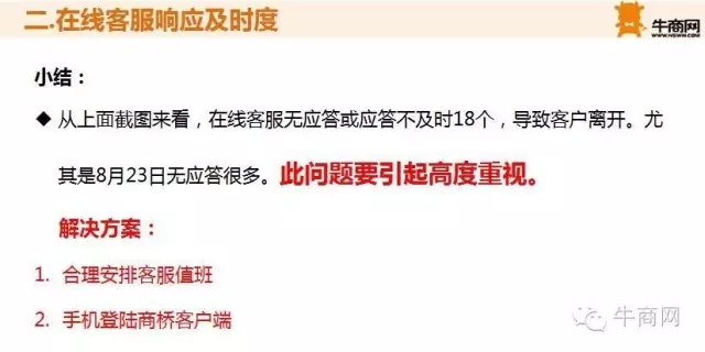 最近牛商網(wǎng)做了一個關(guān)于中小企業(yè)網(wǎng)銷客服的調(diào)查,發(fā)現(xiàn)大多數(shù)企業(yè)都比較忽視客服崗位??头藛T基本都是兼職,運營推廣人員兼、銷售業(yè)務(wù)兼、甚至還有老板兼的;即使有專門的客服,也是由沒有工作經(jīng)驗的應(yīng)屆畢業(yè)生擔(dān)任。   不專業(yè)客服的試用期長,從接觸到成熟獲得線索時間長。按照網(wǎng)絡(luò)營銷九連環(huán)法則,花錢推廣帶來了流量,網(wǎng)站營銷力也很牛逼,客戶終于詢盤;線索卻斷在了承上啟下的客服環(huán)節(jié),著實冤枉。     網(wǎng)絡(luò)營銷九連環(huán)   所以不管是兼職還是全職客服,都要保證在線時間和加強專業(yè)度的培養(yǎng)。為了讓企業(yè)的網(wǎng)絡(luò)營銷30天