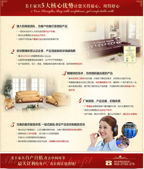 上面一個板塊區(qū)域以產(chǎn)品展示為主,客戶一進來就能了解產(chǎn)品信息,同時家具進行了詳細的分類,包含大類、小類,針對每一個進來的訪客都有可能找到自己所需要的產(chǎn)品,抓穩(wěn)每位潛在的客戶。