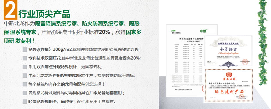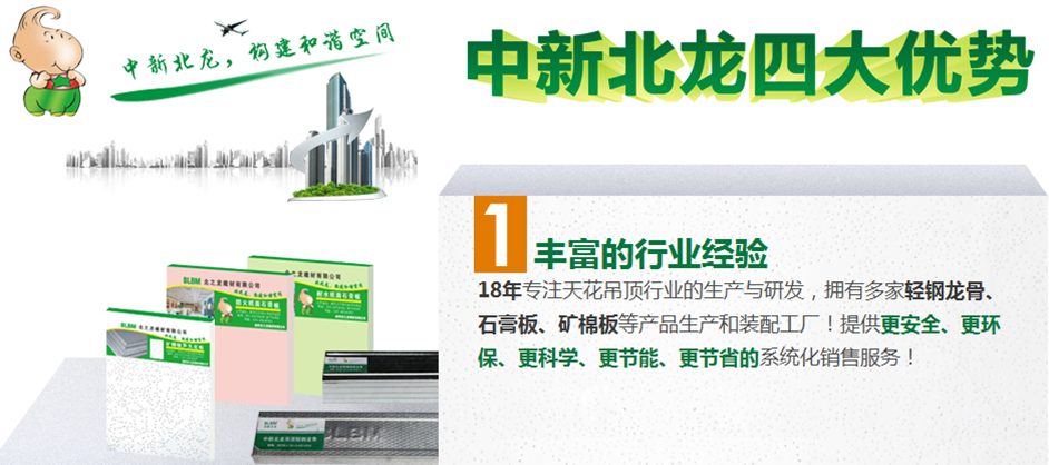 南京北之龍建材工貿有限公司,是一家集生產制造、配套銷售和國際貿易于一體的實業(yè)公司。專業(yè)生產定制中新北龍輕鋼龍骨、石膏板吊頂、金屬天花吊頂、礦棉板吊頂、硅鈣板吊頂,是北新集團龍牌南京總代理,擁有多條大型現代化流水生產線。