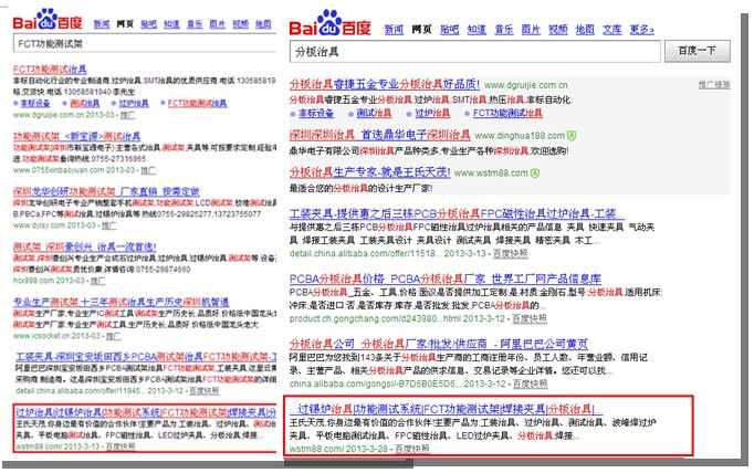 經(jīng)過半年的運(yùn)行,公司的100個(gè)關(guān)鍵詞基本上百度、谷歌都有收錄,其中公司的核心產(chǎn)品關(guān)鍵詞如過爐治具、手機(jī)測試治具、平板電腦測試治具、FCT功能測試治具等都登上了百度、谷歌首頁。