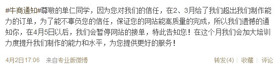 牛商網(wǎng)在完成這些訂單之后會(huì)恢復(fù)網(wǎng)站接單,目前大家要提交營(yíng)銷型網(wǎng)站制作的訂單可能就要大家先等待一段時(shí)間了,不過大家也可以先預(yù)約