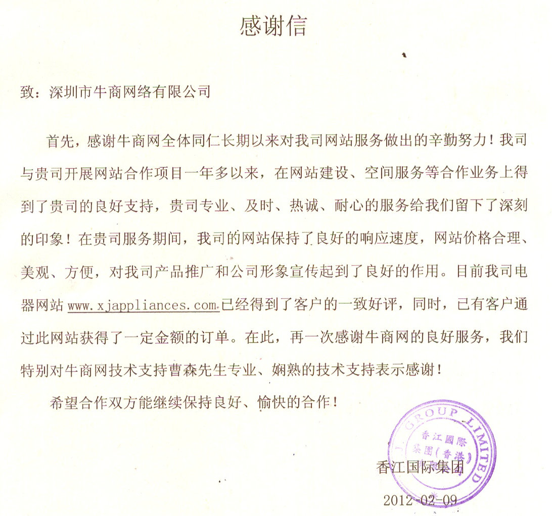 (香江國(guó)際給牛商網(wǎng)發(fā)來(lái)的表?yè)P(yáng)信)