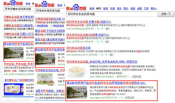搜索引擎優(yōu)化情況:重點(diǎn)關(guān)鍵詞“蕎麥低糖食品招商加盟”和“蕎麥速食面招商加盟”均排在百度的首頁(yè)第1名;“有機(jī)綠色食品招商加盟”排在百度首頁(yè)第2名