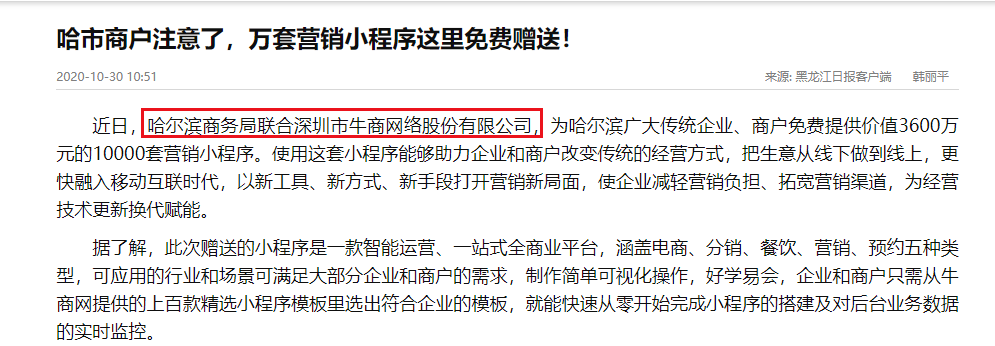 此次牛商網(wǎng)贈(zèng)送的價(jià)值3600萬(wàn)元的10000套營(yíng)銷小程序,受到哈爾濱眾多企業(yè)的歡迎與認(rèn)可, 地方官方媒體也紛紛報(bào)道這一喜訊,對(duì)此提出肯定。