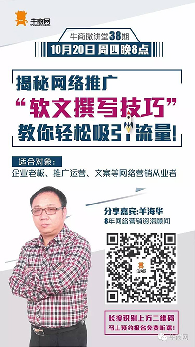 10月20日周四晚8點(diǎn),牛商微講堂特邀8年網(wǎng)絡(luò)營銷專家羊海華老師手把手教你網(wǎng)絡(luò)推廣“軟文撰寫技巧”,教你輕松吸引流量。揭秘中小企業(yè)老板們必知的網(wǎng)站推廣軟文營銷“套路”。