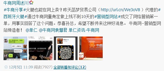 火腿也能在網(wǎng)上賣?12月4日菡夢貿(mào)易公司代理的西班牙火腿通過牛商網(wǎng)量身定做上線不到10天的營銷型網(wǎng)站成交了網(wǎng)絡(luò)營銷第一單,用事實回答了這個問題。恭喜孫總,希望不斷傳來這種好消息。牛商網(wǎng)--營銷型網(wǎng)站締造者!