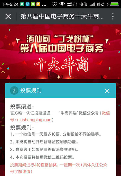 投票僅僅只開始了三天,但故事卻奇妙地發(fā)生!第七屆十大牛商評選開始投票時,武漢遠光瑞康科技董事長董林藝第一時間把參選十大牛商拉票微信發(fā)到朋友圈。沒想到,不到20分鐘北京的譚總就發(fā)微信要官網(wǎng)地址。