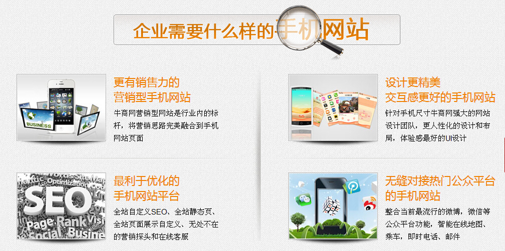 牛商網(wǎng)提供專(zhuān)業(yè)的營(yíng)銷(xiāo)型手機(jī)網(wǎng)站建設(shè)服務(wù),如果您想了解更多有關(guān)“手機(jī)網(wǎng)站”的信息,關(guān)注牛商網(wǎng)官方微信:nsw88com