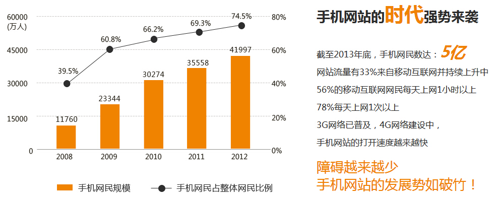 在未來(lái)五年內(nèi),純粹的PC站點(diǎn)將被淘汰掉70%的流量。隨著移動(dòng)終端及及移動(dòng)網(wǎng)絡(luò)環(huán)境(3G、4G、WIFI等)的升級(jí),使用手機(jī)查看網(wǎng)頁(yè)和上網(wǎng)的人也會(huì)越來(lái)越多,應(yīng)用也越來(lái)越廣泛,手機(jī)網(wǎng)站建設(shè)領(lǐng)域?qū)?huì)為企業(yè)公司帶來(lái)巨大的利益。