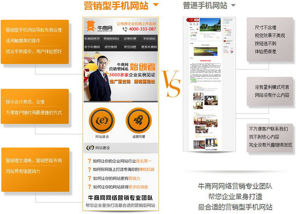 牛商網(wǎng)五年專注做營(yíng)銷型網(wǎng)站,為您打造精品手機(jī)網(wǎng)站,提供量身定制方案,包括手機(jī)網(wǎng)站策劃,手機(jī)備案,手機(jī)域名主機(jī),手機(jī)網(wǎng)站設(shè)計(jì)建設(shè),手機(jī)功能模塊培訓(xùn),手機(jī)網(wǎng)站運(yùn)營(yíng)維護(hù)等一站式服務(wù),讓你快速提升品牌形象,輕松遨游互聯(lián)網(wǎng)大海。詳情請(qǐng)咨詢:4000-333-087。
