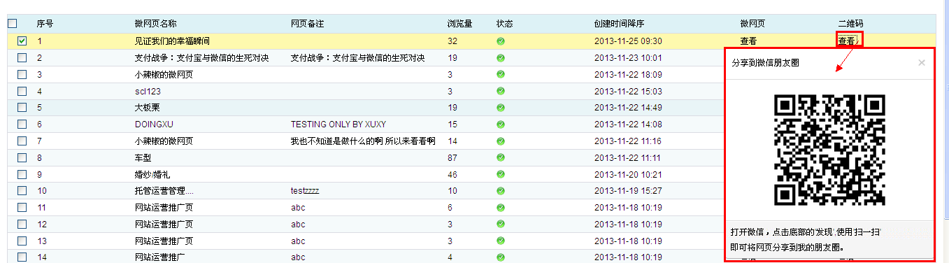 在制作完微網(wǎng)頁(yè),保存時(shí),系統(tǒng)自動(dòng)生成一張?jiān)L問的二維碼圖片;點(diǎn)擊列表后的二維碼 查看,記得彈出當(dāng)前微網(wǎng)頁(yè)的推廣二維碼;