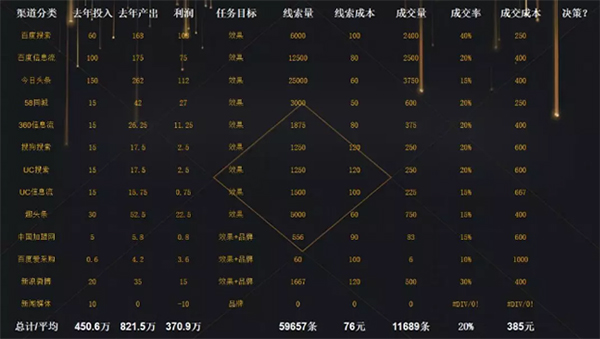 計算歷史數(shù)據(jù),算出投入產(chǎn)出比然后決定渠道的變化、預(yù)算分配和實際操作人員的變化,推廣渠道任務(wù)的分配。我們可以依照上圖(某企業(yè)的2019年度渠道投放收入數(shù)據(jù))做出自己公司的數(shù)據(jù)圖,并根據(jù)圖中的數(shù)據(jù)進行決策調(diào)整:如果人員充足的話,選擇多渠道覆蓋推廣;人員不充足的話,選擇交易量&利潤大的渠道。預(yù)算夠的話,選擇交易率較高的渠道;預(yù)算不足,則選擇交易成本低的渠道。