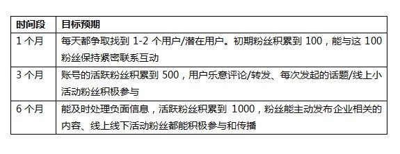 同樣,企業(yè)的微博運(yùn)營也可以給自己設(shè)定下表一樣的分階段目標(biāo)預(yù)期: