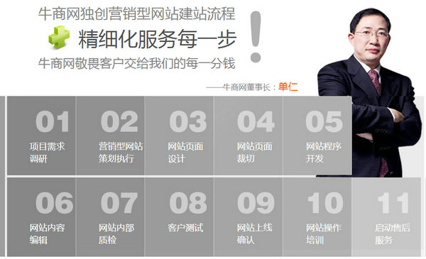 在這11道基本流程中,每一項(xiàng)流程都有詳細(xì)的要求以及標(biāo)準(zhǔn),牛商網(wǎng)系統(tǒng)化的網(wǎng)站建設(shè)流程為客戶網(wǎng)站建設(shè)提供有力的保障,每一道建站流程嚴(yán)格把關(guān),以最好的服務(wù)為客戶打造一個(gè)“網(wǎng)絡(luò)賺錢機(jī)器——營(yíng)銷型網(wǎng)站”。