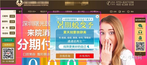 這是一個(gè)整形美容網(wǎng)站,網(wǎng)站首頁只有一屏,主要內(nèi)容幾乎被3個(gè)不同的探頭遮住。咨詢窗口過多似乎是醫(yī)療行業(yè)的通病,這個(gè)還算稍微正常,有的網(wǎng)站更是恨不得滿屏都是探頭,還帶閃動(dòng)的,看著都頭暈,趕緊關(guān)了吧。